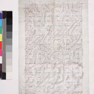 Bordered by Rancho San Francisco. Soledad & Mint canyons and north, showing surface detail, topography, acreages, courses & section numbers; road from Newhall to Elizabeth Lake, S.P.R.R.; red & blank ink with color wash. Alt. title supplied by cataloger.