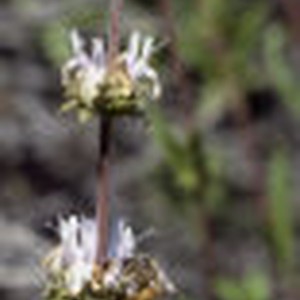 Two white flowers from shrub with bee at San Antonio Ranger Station.