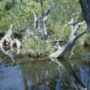 Fallen trees in creek surrounded by green foliage and California pitcherplants.