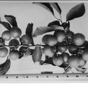 Photo, black and white: Plums on a branch with cluster and ruler at bottom. Caption: "Cranberry Plum MM-69 North limb of central branch" Photographed 1928