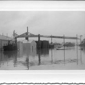 Photo--black and white: The flooded streets of east Sebastopol around the Sebastopol Road and Laguna area. The Barlow apple processing plant is seen with its overhead conveyor belt. 1951