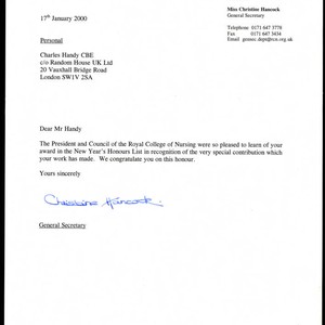 Correspondence to Charles Handy from Christine Hancock congratulating Handy on his award in the New Year's Honours List. Hancock states that the Royal College of Nursing's President and Council were very pleased to learn of Handy's award.