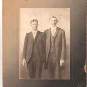 Photo--black and white: Portrait photo of George Osborn on the right and unidentified man on left. Bottom right corner is embossed "Harris CHIHUAHUA." Osborn Rogers family.
