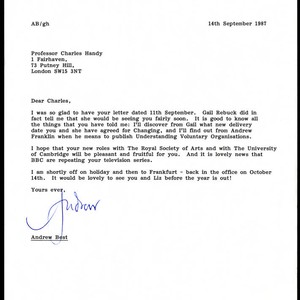 Letter from Andrew Best to Charles Handy in response to Handy's previous letter, September 14, 1987; Charles Handy Papers; Box 9, Folder 11; 1 page