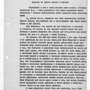 A letter-appeal from E.A. Voronaev to all churches of CFE (Christians of Faith Evangelical) which were out of unity, Odessa, 1 October 1958. [Description English/roman)] Обращение Воронаевой Е.А. ко всем церквям ХВЕ (Христиан Веры евангельской) которые находятся в не единства, Одесса 01.10.1958 год. [Description (original non-English/roman language/script)]