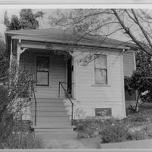 Photo, black and white: Sebastopol house at 6968 Wallace Street a Hip roof cottage built in 1905 in the Bonnardel Addition. House photographed in 1993 by Evelyn McClure for her book "Sebastopol, California : History, Homes and People."