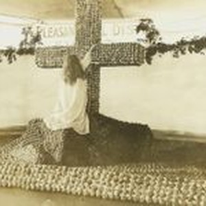 Postcard -black and white photo: The 1914 Gravenstein Apple Show with an apple display of a child at the Cross made of whole and dried apples. The sign in the rear: "Pleasant Hill District." Exhibit"