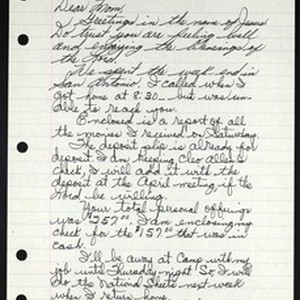 Willie Mae [Rivers?] (Church of God in Christ), letter, 1984 March 4, to "mom" (Church of God in Christ). Regarding finances with enclosure: Memphis financial report of 1884 March 3. [Description English/roman)]