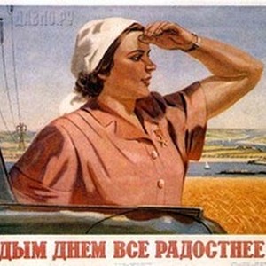 Soviet social poster. Caption reads, "С каждым днем все радостнее жить! / S kazhdym dnem vse radostnee zhit'!", meaning, "Life gets happier every day!". [Description English/roman)]