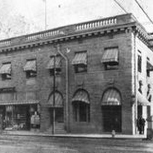 Photo--Black and white: Sebastopol Main Street corner with Analy Savings Bank and Worth's Drug Store.