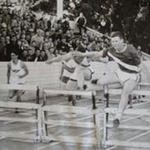 Photo--Black and white: Analy High School Tigers track team, 1950. Photo one : Analy hurdler Bill Scheidecker. Photo two: foot race.
