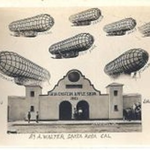 Postcard--black and white: Postcard showing the 1913 Gravenstein Apple Show main entrance, which looks like a Mission style building. Seven dirigibles are shown above each with different cities labeled below the ship.