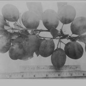 Photo--black and white: Plums on a branch with a ruler at bottom and caption: "ZZ-8 (Broken limb) L.C.S. Best Prune Photographed 1928