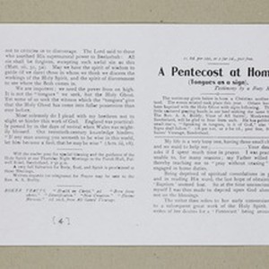 Tract consisting an anonymous testimony of a woman's pentecostal experience [2 pages] entitled "A pentecost at home, (tongues as a sign). Testimony of a busy mother". [Description English/roman)]