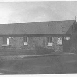 Photo--black and white: The P&SR Powerhouse building in Sebastopol--facade facing south. The Powerhouse was built in 1903 and was the power source for the Petaluma & Santa Rosa Railroad which was an electric railway. The first cars were run over the line in 1904, and the later named Hogan Building, built of stone from a local Stony Point quarry, is one of the few in the area that made it through the 1906 earthquake.