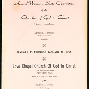 Annual women's state convention program, Texas Northeast, Love Chapel Church of God in Christ, Fort Worth, Texas, 1966 January 10-15. [Description English/roman)]