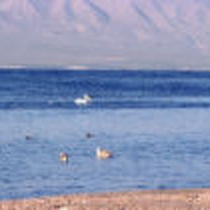 A pelican swimming in the water of Meccca Beach with other birds nearby.