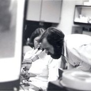 Photo--black and white: Marvin Fuller, X-ray tech at microscope and Charlene Rundstrom lab, Palm Drive Hospital, 1978.