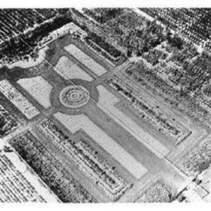 Photo--black and white: The Stark Nurseries' formal & experimental gardens in Louisiana, Missouri 1928. The Stark Bros Nurseries took over the Burbank Experiment Farm in Sebastopol after Burbank's death in 1926.