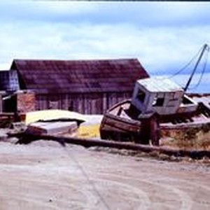 Slide, color transparency: Old beached boats at Bodega or Tomales Bay, 1975