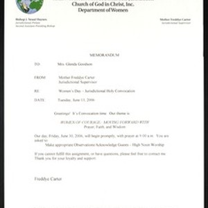 Freddye Carter (Church of God in Christ), Waco, Texas, memo, 2006 June 13, to Glenda Goodson (Church of God in Christ). [Description English/roman)]