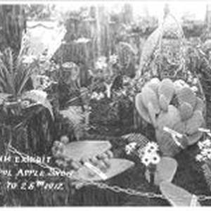 Photo--black and white: Gravenstein Apple Show display of Burbank Exhibit in August, 1912. Flowers, cacti and fruit displayed on redwood stumps.