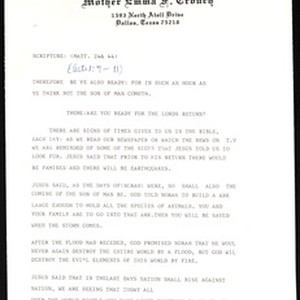 Emma F. Crouch. "Are you ready for the Lord's return?", notes for a sermon or lecture (on Crouch, Church of God in Christ, Dallas, Texas letterhead), [s.d.]. [Description English/roman)]