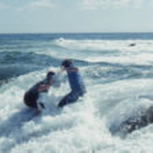 Oscar Gonzales and Kit Faubion being washed away by wave on Sugarloaf Point.