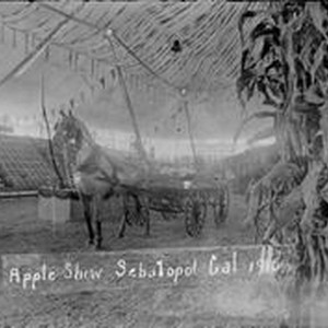 Negative glass-plate photo: From a glass plate negative made by William Borba. Gravenstein Apple Show exhibit 1915 in Sebastopol. A horse and buggy display with apple boxes in background.