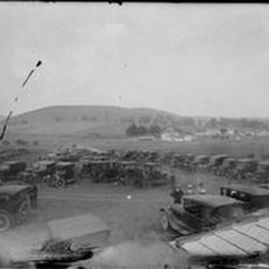 Negative glass-plate photo: From a glass plate negative made by William Borba. A large number of vintage cars parked in a field circa 1915. Trees and hills are seen in the background. The photo was taken from the roof of a building and several men and women are seen beside cars.