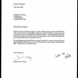 Letter from Professor D.T. Otley to Charles Handy expressing thanks to Handy for his previous letter and requesting his future help with a journal, June 13, 1989; Box 9, Folder 13; 1 page