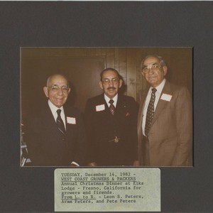 West Coast Growers and Packers Annual Christmas Dinner at Elks Lodge - Fresno, California for growers and friends. From left to right: Leon S. Peters, Aram Peters, and Pete Peters