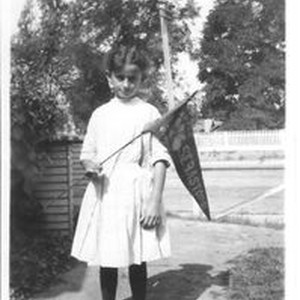 Photo--black and white: Mary Louise McChristian (m. Frates) circa 1914 at about 11 years of age. She is outside holding a Sebastopol Apple Show pennant, a road and picket fence is in the background. Mary Louise is granddaughter to James McChristian, an 1846 Bear Flagger.