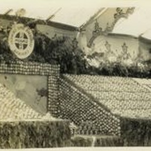 Postcard--black and white photo--Gravenstein Apple Show 1910--Display of boxes of apples of sponsored by the Sebastopol Apple Growers Union California (SAGU). Photo is reversed. The first Sebastopol Apple Show was held in a tent across from the Petaluma & Santa Rosa Depot in August, 1910 and promoted local fruit in various creative ways.