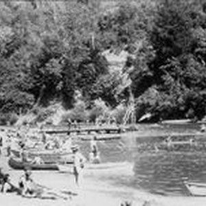 Postcard--photo--black and white: Boating and recreation scene at Guernewood Park in Guerneville, on the Russian River about 1920's. Canoes and swimmers in the river and on the beach. Redwoods and pier in background.