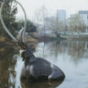 A statue of a mammoth standing in the tar pits with the Los Angeles County Museum of Art in the background.