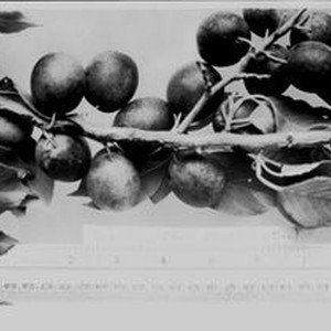 Photo, black and white: Plums on a branch with ruler at the bottom. Caption: Cranberry Plumb HH-1 Cranberry Plum (Entire Tree)." Photographed 1928.
