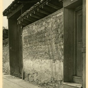 Adobe, Monterey, California: adobe wall connecting doorway and gate [Cooper-Molera Adobe, 510 Munras St.].