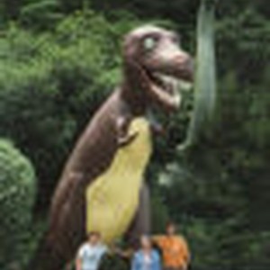 "David, Alice, [and] Ian" standing in front of a tyrannosaurus and apatosaurus model in the prehistoric gardens.