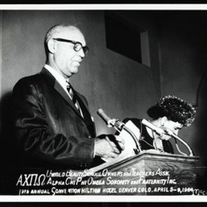 Photograph of an unidentified man and Dr. Arenia C. Mallory standing before microphones at a podium, 9th Annual Convention, Hilton Hotel, Denver, Colorado, 1964 April 5-9. "United Beauty School Owners and Teachers Assn., ΑΧΠΩ Alpha Chi Phi [sic] Omega sorority and Fraternity Inc." -- part of caption. [Description English/roman)]