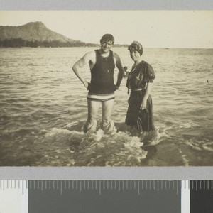 Jack and Charmian London stand knee-deep in water at Waikiki Beach with Diamond head in the distance.