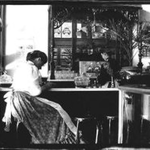 Photo -black and white: Interior photo a of soda fountain with woman seated at the counter and another woman beind the counter in Worth's Drugstore in 1903.