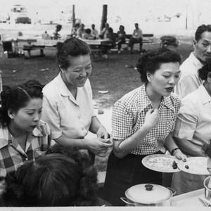 This photograph includes Nowland (first from left) and Mabel Hong (third from left) as part of a group picnic in a park. Hong family papers. The Huntington Library, San Marino, CA.