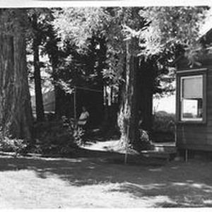 Photo--black and white: The Taylor property on Taylor Lane west of Sebastopol in 1942. The Taylor house amidst some Redwood trees.