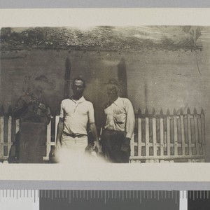 Jack London and two unidentified men stand in front of fenced building. Title and date transcribed from envelope. Two figures in photo are in negative due to poor exposure.