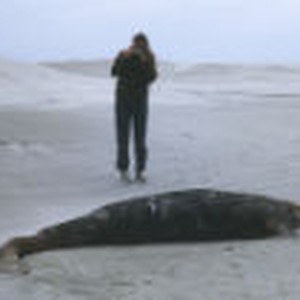 Marty Hartmann taking a picture of a dead baby whale lying in the sands of Scammon's Lagoon.