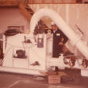 Man standing behind white machinery.