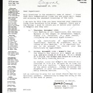 Emma F. Crouch (Church of God in Christ), Dallas, Texas, letter, 1994 September 28, to "supervisor" (Church of God in Christ). Original version. [Description English/roman)]