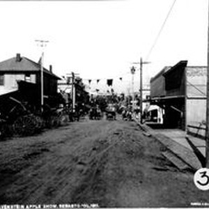 Photo--black and white: On Bodega Avenue looking east to Main Street Sebastopol in 1911. Banners are hung across the street in celebration of the 1911 Gravenstein Apple Fair.