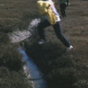Student Carol Masters attemps to leap over small channel in the Morro Bay salt marsh.